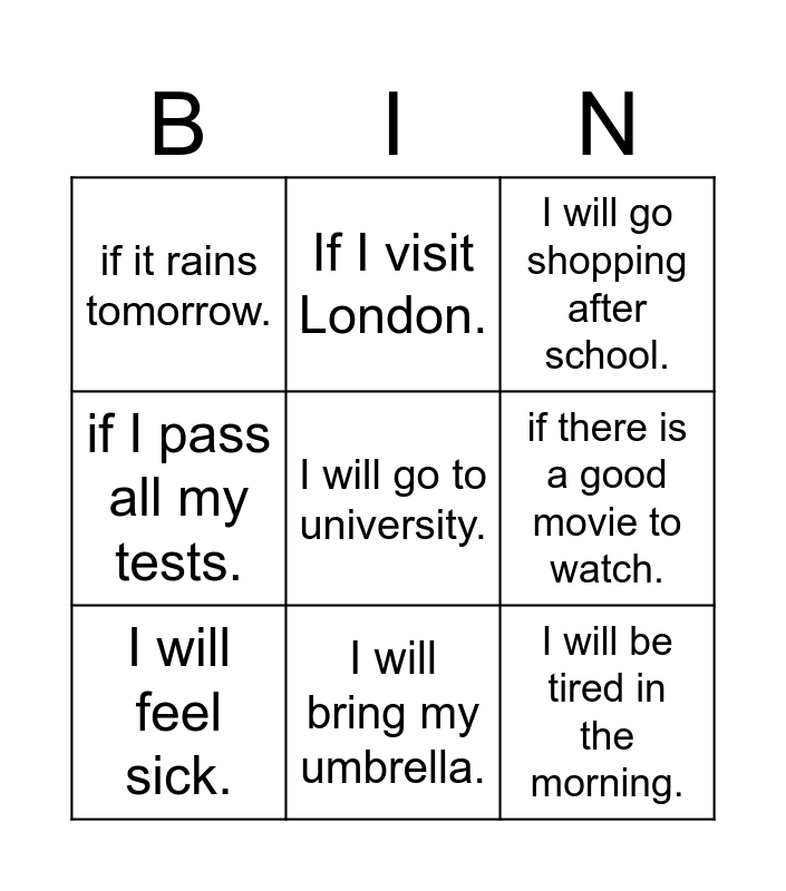 This bingo card has 15 words: Free!, I will pass the test., I will go shopping after school., if it rains tomorrow., I will bring my umbrella., I will go to university., I will buy a new car., I will go to the park, if there is a good movie to watch., I will be tired in the morning., If I don’t do my homework., if I pass all my tests., I will feel sick., If I visit London. and I will learn about new cultures..