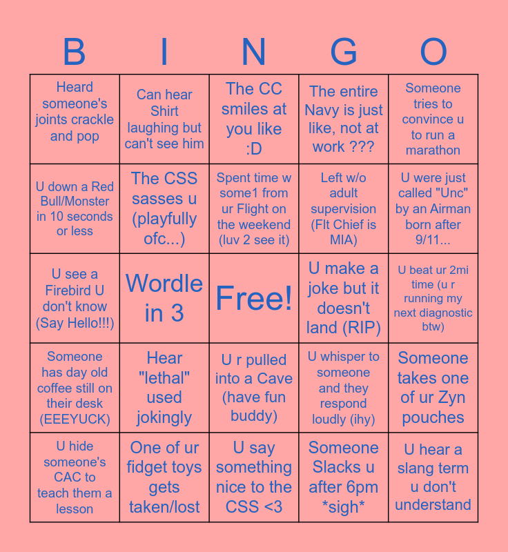 This bingo card has a free space and 24 words: Hear "lethal" used jokingly, One of ur fidget toys gets taken/lost, Spent time w some1 from ur Flight on the weekend (luv 2 see it), U hide someone's CAC to teach them a lesson, Someone tries to convince u to run a marathon, Heard someone's joints crackle and pop, U down a Red Bull/Monster in 10 seconds or less, Can hear Shirt laughing but can't see him, U make a joke but it doesn't land (RIP), U r pulled into a Cave (have fun buddy), Left w/o adult supervision (Flt Chief is MIA), U see a Firebird U don't know (Say Hello!!!), U whisper to someone and they respond loudly (ihy), Someone takes one of ur Zyn pouches, The CSS sasses u (playfully ofc...), Someone Slacks u after 6pm *sigh*, U beat ur 2mi time (u r running my next diagnostic btw), The CC smiles at you like :D, U were just called "Unc" by an Airman born after 9/11..., Wordle in 3, U hear a slang term u don't understand, Someone has day old coffee still on their desk (EEEYUCK), The entire Navy is just like, not at work ??? and U say something nice to the CSS <3.