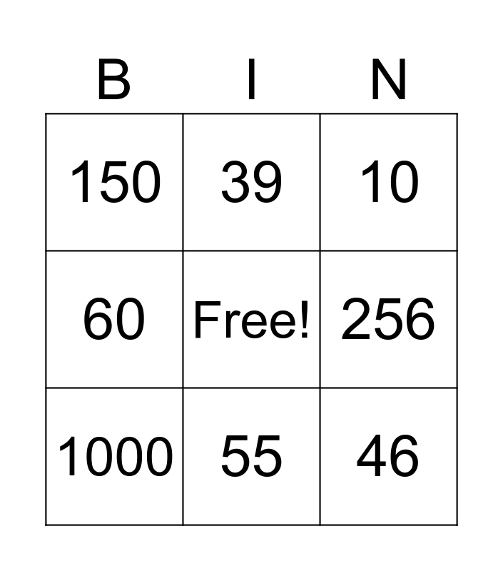 This bingo card has a free space and 8 words: 256, 10, 39, 1000, 150, 46, 60 and 55.
