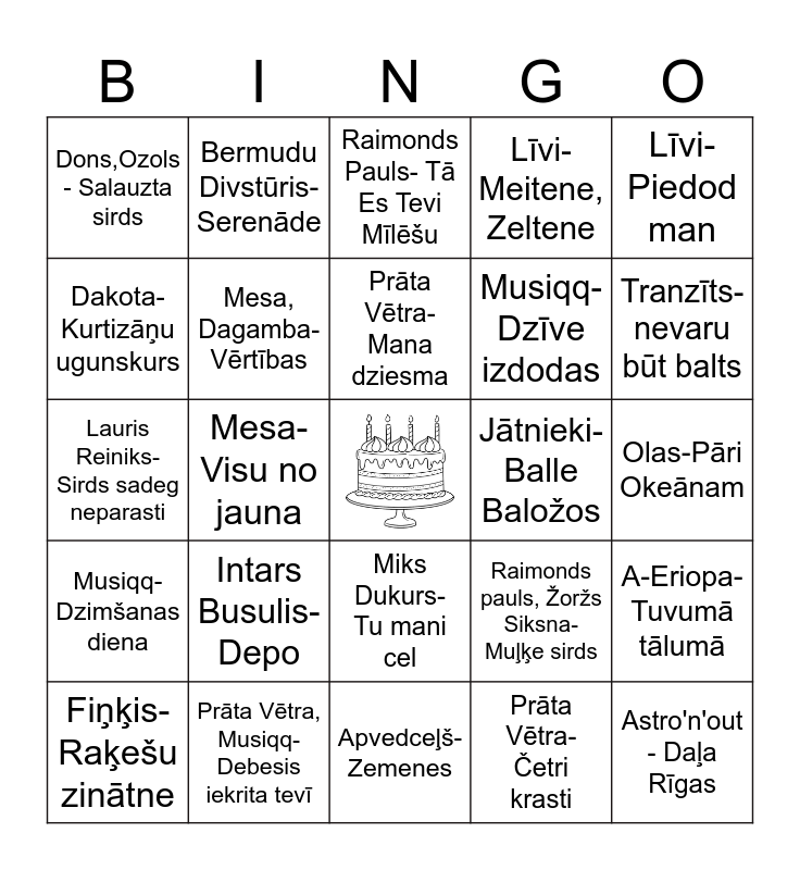This bingo card has a free space and 24 words: Intars Busulis- Depo, Prāta Vētra, Musiqq- Debesis iekrita tevī, Prāta Vētra- Mana dziesma, Fiņķis- Raķešu zinātne, Līvi-Piedod man, Dons,Ozols - Salauzta sirds, Dakota- Kurtizāņu ugunskurs, Bermudu Divstūris- Serenāde, Jātnieki-Balle Baložos, Miks Dukurs- Tu mani cel, Musiqq- Dzīve izdodas, Lauris Reiniks- Sirds sadeg neparasti, Raimonds pauls, Žoržs Siksna- Muļķe sirds, A-Eriopa- Tuvumā tālumā, Mesa, Dagamba- Vērtības, Prāta Vētra- Četri krasti, Olas-Pāri Okeānam, Raimonds Pauls- Tā Es Tevi Mīlēšu, Tranzīts- nevaru būt balts, Mesa- Visu no jauna, Astro'n'out - Daļa Rīgas, Musiqq-Dzimšanas diena, Līvi- Meitene, Zeltene and Apvedceļš- Zemenes.