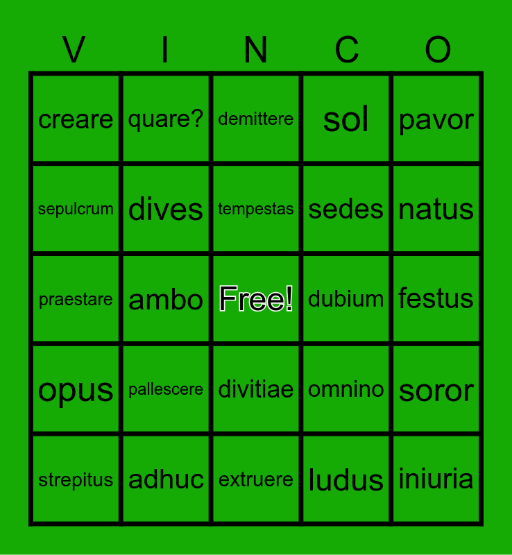 This bingo card has a free space and 30 words: adhuc, afficere, ambo, consulare, creare, demittere, dives, divitiae, dubium, extruere, festus, iniuria, ludus, magister, natus, nimis, omnino, opus, pallescere, pavor, praestare, praeterea, quare?, sedes, sepulcrum, sol, soror, strepitus, tempestas and timor.