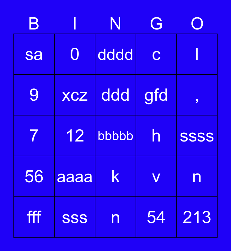 This bingo card has a free space and 24 words: aaaa, sss, ddd, fff, l, sa, 9, 0, h, k, gfd, 7, v, n, xcz, 54, ssss, dddd, ,, 12, 213, 56, c and n.