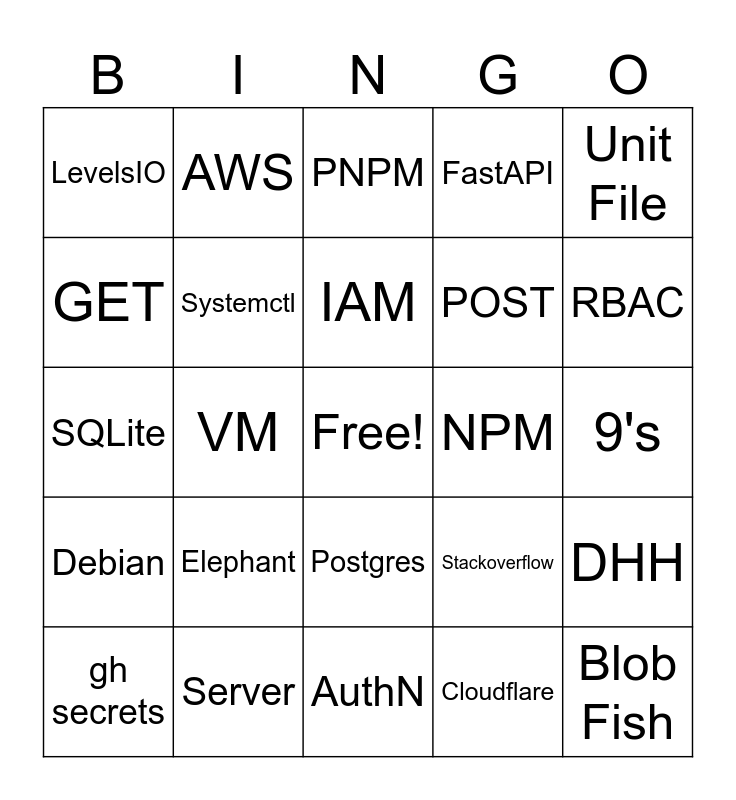 This bingo card has a free space and 32 words: Cloudflare, Hyperscaler, VM, Ubuntu, Debian, Systemctl, Unit File, DHH, AWS, GCP, IAM, PNPM, UV, PIP, NPM, .env, gh secrets, SQLite, Postgres, Elephant, Stackoverflow, Vercel, 9's, Server, Blob Fish, FastAPI, POST, GET, LevelsIO, AuthN, AuthZ and RBAC.