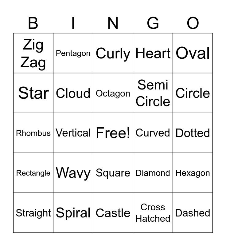 This bingo card has a free space and 29 words: Straight, Diagonal, Vertical, Horizontal, Zig Zag, Curly, Cloud, Wavy, Curved, Spiral, Dotted, Dashed, Castle, Cross Hatched, Circle, Triangle, Square, Rectangle, Oval, Rhombus, Diamond, Trapezoid, Semi Circle, Star, Heart, Pentagon, Hexagon, Octagon and Crescent.