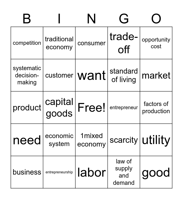 This bingo card has a free space and 29 words: business, capital, capital goods, command economy, competition, consumer, customer, economic system, entrepreneur, entrepreneurship, factors of production, good, labor, law of supply and demand, market, market economy, 1mixed economy, need, opportunity cost, product, scarcity, service, standard of living, systematic decision-making, trade-off, traditional economy, utility, want and wages.
