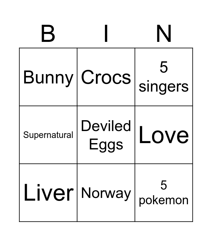 This bingo card has a free space and 8 words: Love, 5 singers, Crocs, Liver, Bunny, 5 pokemon, Supernatural and Norway.