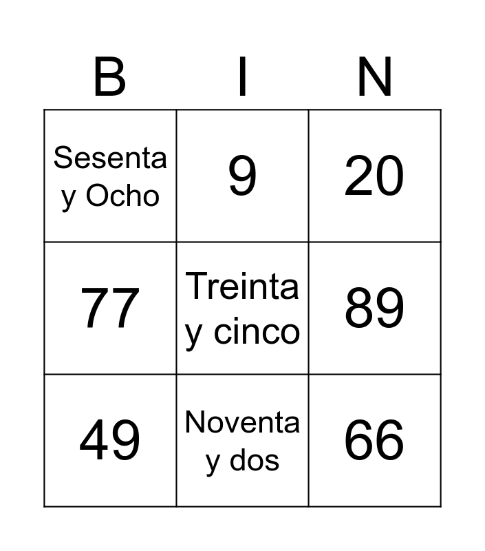 This bingo card has a free space and 8 words: 89, 20, 9, 49, Sesenta y Ocho, 66, 77 and Noventa y dos.