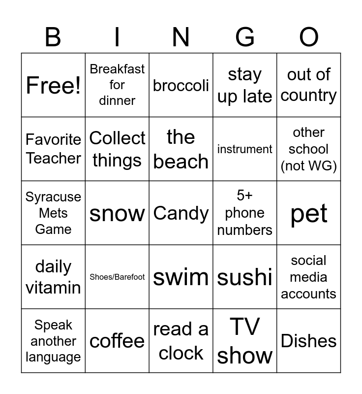 This bingo card has 70 words: Slibling, pet, allergy, pizza, coffee, wake up early, stay up late, out of state, out of country, birthday month, social media accounts, football, Free!, broccoli, cooking, snow, swim, instrument, cursive, daily vitamin, 5+ phone numbers, sushi, other school (not WG), Harry Potter, Marvel movies, puzzles, camping, movie, TV show, Moved houses, Breakfast for dinner, Breakfast today?, Art class <3, Dance, Baseball, Tennis, Holiday, Best Art Materials, Worst Art Material, Favorite Teacher, Dishes, Shoes/Barefoot, Candy, Board game, Music Concert, Collect things, Speak another language, Disney movie, Hot Sauce, laundry, State Fair, The news, Crunch Game, SU Game, read a clock, scary movies, the beach, dyed hair, video games, card game, Syracuse Mets Game, reading a book, basketball, baking, favorite color, Star Wars, Play sport, W/P/FT, Fav Cuisine and Ketchup or Mustard.