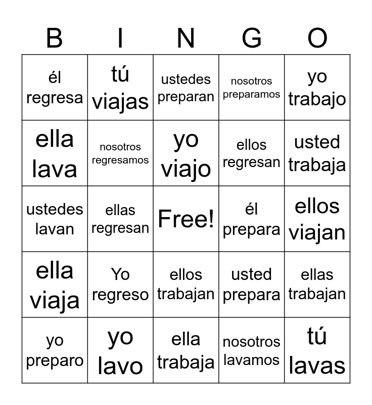 This bingo card has a free space and 24 words: Yo regreso, yo lavo, yo viajo, yo preparo, yo trabajo, él regresa, ella lava, tú viajas, él prepara, ellos trabajan, ellos regresan, ustedes lavan, usted prepara, ellas trabajan, nosotros regresamos, nosotros lavamos, ellos viajan, ustedes preparan, usted trabaja, ellas regresan, tú lavas, ella viaja, nosotros preparamos and ella trabaja.