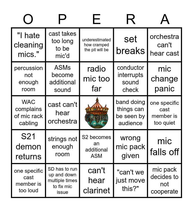 This bingo card has a free space and 24 words: strings not enough room, SD has to run up and down multiple times to fix mic issue, radio mic too far, one specific cast member is too loud, orchestra can't hear cast, "I hate cleaning mics.", percussion not enough room, cast takes too long to be mic'd, band doing things can be seen by audience, S2 becomes an additional ASM, conductor interrupts sound check, WAC complains of mic rack cabling, wrong mic pack given, mic falls off, ASMs become additional sound, "can't we just move this?", one specific cast member is too quiet, underestimated how cramped the pit will be, mic change panic, cast can't hear orchestra, mic pack decides to not cooperate, S21 demon returns, set breaks and can't hear clarinet.