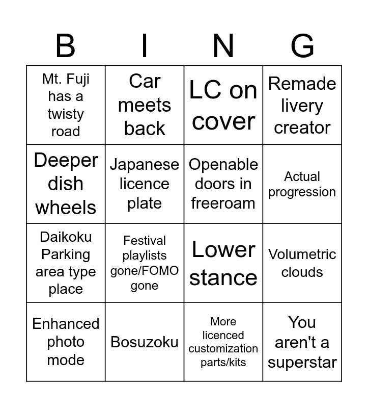 This bingo card has 16 words: Bosuzoku, Volumetric clouds, LC on cover, Mt. Fuji has a twisty road, Daikoku Parking area type place, Car meets back, Lower stance, More licenced customization parts/kits, Deeper dish wheels, Japanese licence plate, Enhanced photo mode, Remade livery creator, Festival playlists gone/FOMO gone, Actual progression, Openable doors in freeroam and You aren't a superstar.
