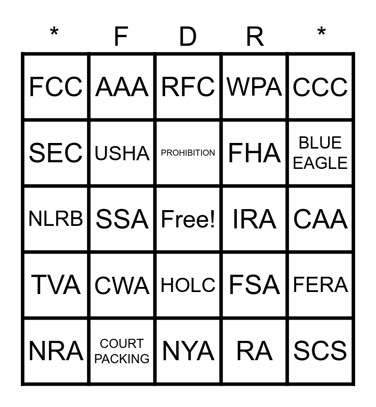 This bingo card has a free space and 31 words: NYA, REA, SSA, FDIC, FCC, RFC, USHA, FSA, IRA, RA, CAA, SCS, BOB, GREAT DEPRESSION, BLUE EAGLE, GREEN BELT PROGRAM, FERA, CWA, TVA, HOLC, CCC, PWA, NRA, AAA, FHA, SEC, WPA, NLRB, COURT PACKING, PROHIBITION and HOOVER DAM.