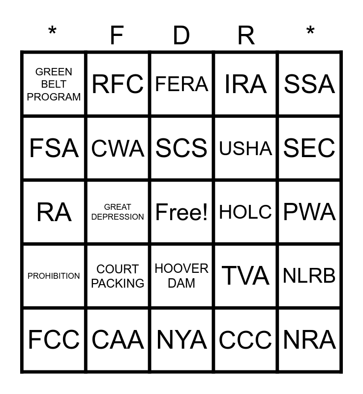 This bingo card has a free space and 31 words: NYA, REA, GREAT DEPRESSION, BLUE EAGLE, GREEN BELT PROGRAM, FERA, CWA, TVA, HOLC, CCC, PWA, NRA, AAA, FHA, SEC, WPA, NLRB, COURT PACKING, PROHIBITION, HOOVER DAM, SSA, FDIC, FCC, RFC, USHA, FSA, IRA, RA, CAA, SCS and BOB.