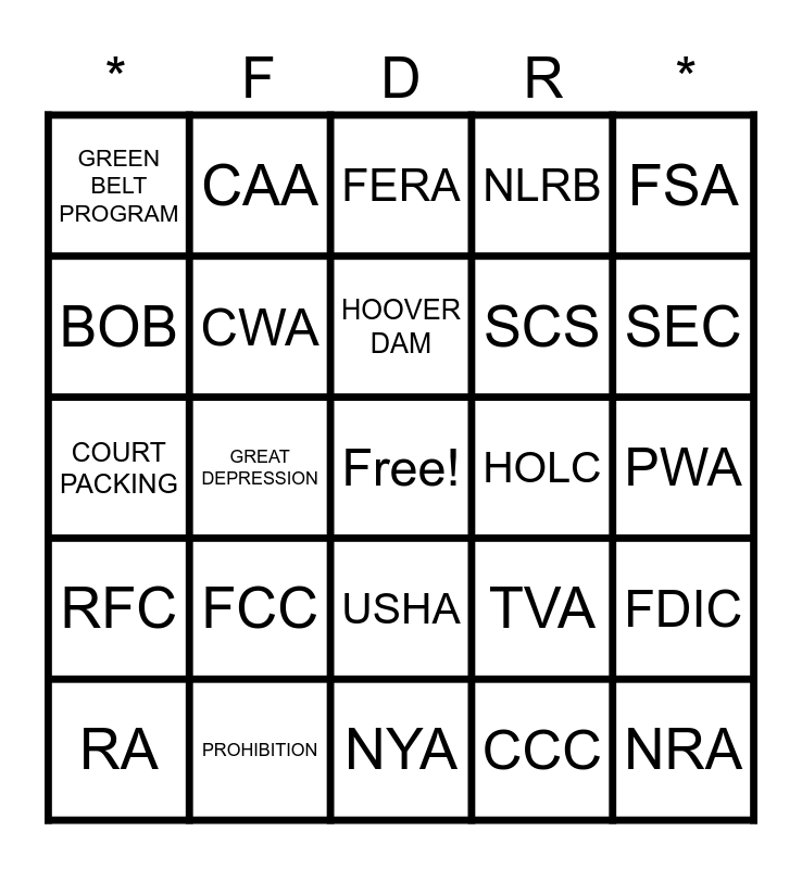 This bingo card has a free space and 31 words: NYA, REA, GREAT DEPRESSION, BLUE EAGLE, GREEN BELT PROGRAM, FERA, CWA, TVA, HOLC, CCC, PWA, NRA, AAA, FHA, SEC, WPA, FDIC, FCC, RFC, USHA, FSA, IRA, RA, CAA, SCS, BOB, NLRB, COURT PACKING, PROHIBITION, HOOVER DAM and SSA.