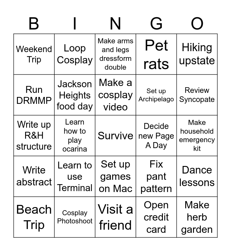 This bingo card has a free space and 24 words: Learn to use Terminal, Cosplay Photoshoot, Make a cosplay video, Beach Trip, Hiking upstate, Weekend Trip, Run DRMMP, Loop Cosplay, Decide new Page A Day, Set up games on Mac, Set up Archipelago, Write up R&H structure, Fix pant pattern, Dance lessons, Jackson Heights food day, Open credit card, Make household emergency kit, Make arms and legs dressform double, Review Syncopate, Learn how to play ocarina, Make herb garden, Write abstract, Pet rats and Visit a friend.