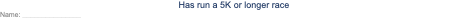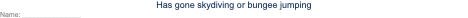Has visited morethan 10 countries Name:_______________ Has a pet thatISN'T a dog or acat Name:_______________ Has been on TV or ina movie Name:_______________ What show or movie?_______________Was in the marchingband (high school orcollege) Name:_______________ What show?______________Has run a 5K orlonger race Name:_______________ Grew up on a farmor rural area Name:_______________ Speaks more thanone language Name:_______________ Other language:_______________Was born in a differentstate or country Name:_______________ Where?_______________Has lived in anothercountry Name:_______________ Other country:_______________Got married or hasa birthday on aholiday Name:_______________ Has goneskydiving orbungee jumping Name:_______________ Played a sport in highschool Name:_______________ What sport?_______________Has been to a concertwith 10,000+ people Name:_______________ What concert?______________Has an irrational fear Name:_______________ What are they afraidof?______________ Is the oldestsibling Name:_______________ Knows how todrive in amanual/stick shiftcar Name:_______________ Has met a celebrity Name:_______________ Which celebrity?_______________Has a go-to karaokesong Name:_______________ What's the song?_______________Has twins in theirfamily Name:_______________ Is the youngestsibling Name:_______________Has won a competition(anything counts) Name:_______________ What'd they win?______________Has rewatched thesame show 3+ times Name:_______________ What show?______________ Plays a musicalinstrument Name:_______________ What instrument?_______________Can solve aRubik's cube Name:_______________ Has visited morethan 10 countries Name:_______________ Has a pet thatISN'T a dog or acat Name:_______________ Has been on TV or ina movie Name:_______________ What show or movie?_______________Was in the marchingband (high school orcollege) Name:_______________ What show?______________Has run a 5K orlonger race Name:_______________ Grew up on a farmor rural area Name:_______________ Speaks more thanone language Name:_______________ Other language:_______________Was born in a differentstate or country Name:_______________ Where?_______________Has lived in anothercountry Name:_______________ Other country:_______________Got married or hasa birthday on aholiday Name:_______________ Has goneskydiving orbungee jumping Name:_______________ Played a sport in highschool Name:_______________ What sport?_______________Has been to a concertwith 10,000+ people Name:_______________ What concert?______________Has an irrational fear Name:_______________ What are they afraidof?______________ Is the oldestsibling Name:_______________ Knows how todrive in amanual/stick shiftcar Name:_______________ Has met a celebrity Name:_______________ Which celebrity?_______________Has a go-to karaokesong Name:_______________ What's the song?_______________Has twins in theirfamily Name:_______________ Is the youngestsibling Name:_______________Has won a competition(anything counts) Name:_______________ What'd they win?______________Has rewatched thesame show 3+ times Name:_______________ What show?______________ Plays a musicalinstrument Name:_______________ What instrument?_______________Can solve aRubik's cube Name:_______________