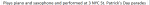 Plays piano and saxophone and performed at 3 NYC St. Patrick's Day parades