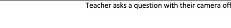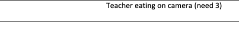 Brodie getsupset about notbeing able tohave time to dobook check in Berrywritessomethingin the chat"OpenHouse"“Deadhorse” Patrick rollseyes from adumbquestion “Holdme tothe fire” “Generalist” "ElectionDay"TalkTeachereating oncamera(need 3)Olberdinglaughing oncamera (noless than 3times)“I haveakid….” Knutson sitsin a largechair withblanket Recordspowerpoint Refers tohimself inthe 3rdperson Linda hasa question(no lessthan 7)Seansounding likehe’s in thebathroom AEAContractTalk “Dicey”Interruptsa teachermid-sentence Teacherasks aquestion withtheir cameraoff Sickleavequestions “Symptoms” Roz stillhasn’tgone intolaborStaffwearinghats(need 3)Brodie getsupset about notbeing able tohave time to dobook check in Berrywritessomethingin the chat"OpenHouse"“Deadhorse” Patrick rollseyes from adumbquestion “Holdme tothe fire” “Generalist” "ElectionDay"TalkTeachereating oncamera(need 3)Olberdinglaughing oncamera (noless than 3times)“I haveakid….” Knutson sitsin a largechair withblanket Recordspowerpoint Refers tohimself inthe 3rdperson Linda hasa question(no lessthan 7)Seansounding likehe’s in thebathroom AEAContractTalk “Dicey”Interruptsa teachermid-sentence Teacherasks aquestion withtheir cameraoff Sickleavequestions “Symptoms” Roz stillhasn’tgone intolaborStaffwearinghats(need 3)