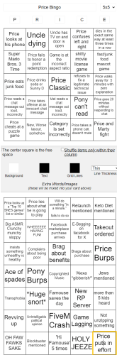 E- Begging on Facebook Bragging about benefits *Huge snort* Game Lagging Pony Burps Price puts in effort OH FAW FAWKS SAKE Eating junk food Takeout ordered Ace of Spades TV on, door open Five Crash 'Alexa *gibberish*' HOLY JEEZE Wrong category Cheating at a puzzle game Pony can't read Big ASMR crunchy munchy sloppy 20+ minutes without responding to chat Revving up AFK for 5+ minutes with no explanation Jews mentioned Refusal to fix a technical issue Using a "Top 10 SNES games" list or similar Facebook marketplace purchase arrives more than 5 kids heard Phone call taken Promise to play a specific game broken Food mascot game Insisting something unhealthy is healthy Relaunch mentioned Dying in same way 3+ times in a row Keto diet mentioned Promise to do something "in a minute" broken Famouse saves the day Incorrect aspect ratio 'Hi Famouse' 5 times Copyrighted music Shitty movie license game Pixel shimmer New, even worse layout Price Burps Complains about money Looking at phone New RP Server Channel points redemption ignored Super Mario Bros. 3 Blockbuster mentioned Same phrase 10 times in a row Price Classic™ Drinking soda/sugary beverage Not unzipping something Bragging about purchase Confusing left and right Price can't read Transphobia Uncle dying WHEEEEEE HAVING FUN! UnIntelligable political opinion Price and Marty fight E- Begging on Facebook Bragging about benefits *Huge snort* Game Lagging Pony Burps Price puts in effort OH FAW FAWKS SAKE Eating junk food Takeout ordered Ace of Spades TV on, door open Five Crash 'Alexa *gibberish*' HOLY JEEZE Wrong category Cheating at a puzzle game Pony can't read Big ASMR crunchy munchy sloppy 20+ minutes without responding to chat Revving up AFK for 5+ minutes with no explanation Jews mentioned Refusal to fix a technical issue Using a "Top 10 SNES games" list or similar Facebook marketplace purchase arrives more than 5 kids heard Phone call taken Promise to play a specific game broken Food mascot game Insisting something unhealthy is healthy Relaunch mentioned Dying in same way 3+ times in a row Keto diet mentioned Promise to do something "in a minute" broken Famouse saves the day Incorrect aspect ratio 'Hi Famouse' 5 times Copyrighted music Shitty movie license game Pixel shimmer New, even worse layout Price Burps Complains about money Looking at phone New RP Server Channel points redemption ignored Super Mario Bros. 3 Blockbuster mentioned Same phrase 10 times in a row Price Classic™ Drinking soda/sugary beverage Not unzipping something Bragging about purchase Confusing left and right Price can't read Transphobia Uncle dying WHEEEEEE HAVING FUN! UnIntelligable political opinion Price and Marty fight