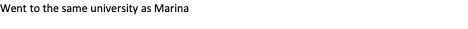 Livesfor icecreamDoes not livein Oslokommune(municipality)Is fromthe USWas in aserious caraccidentlast yearHad 0 hoursof absencein highschoolIs glutenintolerantPlaysfootballevery Friday(whenpermitted)Played leftwing formany years(football)Has workedin «OpenBanking»since 2017LivesinSpainHas adaughternamedKiaraStill hasa milktoothKnowsmore than3languagesLivesinside ring2 in OsloIs pickingout atattoo forspouseBorn inIndiaDoesPhotogrammetryHas adogStarted inOpenBankingin 2018Is fromKeralaIs blonde,but used tohavebrown hairWent tothe sameuniversityas MarinaRepresentingScotlandIs bornin 1989Participatesin PioneerprogrammeSays"GOTEAM!"Is miningcrypto athomeHashitchhikedaround allNewZealandHas over50 plantsat homeHas atwinLivesfor icecreamDoes not livein Oslokommune(municipality)Is fromthe USWas in aserious caraccidentlast yearHad 0 hoursof absencein highschoolIs glutenintolerantPlaysfootballevery Friday(whenpermitted)Played leftwing formany years(football)Has workedin «OpenBanking»since 2017LivesinSpainHas adaughternamedKiaraStill hasa milktoothKnowsmore than3languagesLivesinside ring2 in OsloIs pickingout atattoo forspouseBorn inIndiaDoesPhotogrammetryHas adogStarted inOpenBankingin 2018Is fromKeralaIs blonde,but used tohavebrown hairWent tothe sameuniversityas MarinaRepresentingScotlandIs bornin 1989Participatesin PioneerprogrammeSays"GOTEAM!"Is miningcrypto athomeHashitchhikedaround allNewZealandHas over50 plantsat homeHas atwin