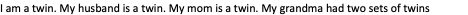 I am a twin. My husband is a twin. My mom is a twin. My grandma had two sets of twins