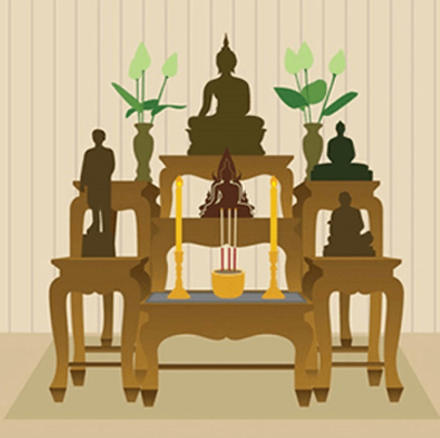 สิ่งก่อสร้างที่มีลักษณะคล้ายลอมฟาง ยอดแหลมภายในบรรจุพระธาตุและอัฐิการฟังพระแสดงธรรมหรือเทศนาคำสอนของพระพุทธเจ้าเอาของใส่บาตรพระที่มาบิณฑบาตส่วนใหญ่เป็นอาหารที่อยู่ของพระสงฆ์กลุ่มหรือชุดของโต๊ะที่ใช้ตั้งพระพุทธรูป หรือสิ่งอันเป็นที่เคารพสักการะ เช่น พระบรมฉายาลักษณ์ศาลาวัดสำหรับพระสงฆ์แสดงธรรมหรือเป็นที่ประกอบการกุศลสาธยายมนต์การสวดสรรเสริญคุณพระรัตนตรัยวันขึ้น 15ค่ำ เดือน3ไปวัดทำบุญวันแรม ๘ค่ำ เดือน6สถานที่สำหรับพระสงฆ์ใช้ประชุมทำสังฆกรรม เช่นประกอบพิธีอุปสมบทการประนมมือทานที่ถวายแก่สงฆ์ หรือภิกษุโดยไม่เจาะจงรูปใดรูปหนึ่งการไหว้การรับศีลมาเป็นหลักปฏิบัติกวาดลานวัดการกราบวันขึ้น 15ค่ำ เดือน8วันแรม 1ค่ำ เดือน8ถวายของพระสงฆ์ด้วยการยกส่งให้วันขึ้น 15ค่า เดือน6ถือดอกไม้พร้อมธูปเทียน เดินวนขวารอบสิ่งที่เคารพบูชาการประกาศตนของผู้แสดงว่าเป็นผู้นับถือพระพุทธศาสนาภาชนะซึ่งเป็นเครื่องบริขารสำหรับภิกษุสามเณรรับอาหารบิณฑบาตสิ่งก่อสร้างที่มีลักษณะคล้ายลอมฟาง ยอดแหลมภายในบรรจุพระธาตุและอัฐิการฟังพระแสดงธรรมหรือเทศนาคำสอนของพระพุทธเจ้าเอาของใส่บาตรพระที่มาบิณฑบาตส่วนใหญ่เป็นอาหารที่อยู่ของพระสงฆ์กลุ่มหรือชุดของโต๊ะที่ใช้ตั้งพระพุทธรูป หรือสิ่งอันเป็นที่เคารพสักการะ เช่น พระบรมฉายาลักษณ์ศาลาวัดสำหรับพระสงฆ์แสดงธรรมหรือเป็นที่ประกอบการกุศลสาธยายมนต์การสวดสรรเสริญคุณพระรัตนตรัยวันขึ้น 15ค่ำ เดือน3ไปวัดทำบุญวันแรม ๘ค่ำ เดือน6สถานที่สำหรับพระสงฆ์ใช้ประชุมทำสังฆกรรม เช่นประกอบพิธีอุปสมบทการประนมมือทานที่ถวายแก่สงฆ์ หรือภิกษุโดยไม่เจาะจงรูปใดรูปหนึ่งการไหว้การรับศีลมาเป็นหลักปฏิบัติกวาดลานวัดการกราบวันขึ้น 15ค่ำ เดือน8วันแรม 1ค่ำ เดือน8ถวายของพระสงฆ์ด้วยการยกส่งให้วันขึ้น 15ค่า เดือน6ถือดอกไม้พร้อมธูปเทียน เดินวนขวารอบสิ่งที่เคารพบูชาการประกาศตนของผู้แสดงว่าเป็นผู้นับถือพระพุทธศาสนาภาชนะซึ่งเป็นเครื่องบริขารสำหรับภิกษุสามเณรรับอาหารบิณฑบาต