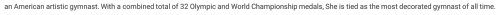 an American artistic gymnast. With a combined total of 32 Olympic and World Championship medals, She is tied as the most decorated gymnast of all time.