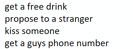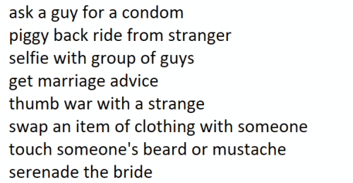 use themen'sbathroomswap anitem ofclothing withsomeonekiss astranger Getasked foryour IDask a guyfor acondom  serenadethe bridegetmarriageadvice thumbwar witha strangetext a partypic to arandomnumber touchsomeone'sbeard ormustacheselfie withgroup ofguyscall thegroom get a guysphonenumberget afreedrink dance onanelevatedsurfacebuy thebride adrink orshotdancewith astrangerkisssomeonepiggyback ridefromstrangerproposeto astrangerchecksomeoneelses Idfind guywithgroomsname findsomeonewith bridesbirthdaymonthToasttheBrideuse themen'sbathroomswap anitem ofclothing withsomeonekiss astranger Getasked foryour IDask a guyfor acondom  serenadethe bridegetmarriageadvice thumbwar witha strangetext a partypic to arandomnumber touchsomeone'sbeard ormustacheselfie withgroup ofguyscall thegroom get a guysphonenumberget afreedrink dance onanelevatedsurfacebuy thebride adrink orshotdancewith astrangerkisssomeonepiggyback ridefromstrangerproposeto astrangerchecksomeoneelses Idfind guywithgroomsname findsomeonewith bridesbirthdaymonthToasttheBride
