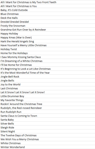 Rockin' Around the Christmas Tree Jingle Bells Holiday Twist Santa Baby My Favorite Things Happy Holiday The Twelve Days of Christmas Dreidel Dreidel Dreidel Santa Claus is Coming to Town Little Drummer Boy Hark the Herald Angels Sing We Wish You a Merry Christmas Home for the Holidays Frosty the Snowman Deck the Halls Have Yourself a Merry Little Christmas Rudolph, the Red- nosed Reindeer Grandma Got Run Over by A Reindeer All I Want for Christmas is My Two Front Teeth Jingle Bell Rock Joy to the World Blue Christmas Happy Xmas (War Is Over) Silver Bells Let It Snow! Let It Snow! Let It Snow! I'll be Home for Christmas All I Want for Christmas is You Winter Wonderland Baby, It's Cold Outside Sleigh Ride White Christmas I Saw Mommy Kissing Santa Claus Silent Night Last Christmas I'm Dreaming of a White Christmas Run Rudolph Run It's Beginning to Look a Lot Like Christmas It's the Most Wonderful Time of the Year Rockin' Around the Christmas Tree Jingle Bells Holiday Twist Santa Baby My Favorite Things Happy Holiday The Twelve Days of Christmas Dreidel Dreidel Dreidel Santa Claus is Coming to Town Little Drummer Boy Hark the Herald Angels Sing We Wish You a Merry Christmas Home for the Holidays Frosty the Snowman Deck the Halls Have Yourself a Merry Little Christmas Rudolph, the Red- nosed Reindeer Grandma Got Run Over by A Reindeer All I Want for Christmas is My Two Front Teeth Jingle Bell Rock Joy to the World Blue Christmas Happy Xmas (War Is Over) Silver Bells Let It Snow! Let It Snow! Let It Snow! I'll be Home for Christmas All I Want for Christmas is You Winter Wonderland Baby, It's Cold Outside Sleigh Ride White Christmas I Saw Mommy Kissing Santa Claus Silent Night Last Christmas I'm Dreaming of a White Christmas Run Rudolph Run It's Beginning to Look a Lot Like Christmas It's the Most Wonderful Time of the Year