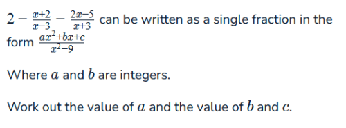 2−x−3x+2−x+32x−5 can be written as a single fraction in the form ax2+bx+cx2−9x2−9ax2+bx+c