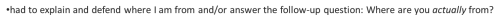 Had to explain and defend where I am from and/or answer the follow-up question: Where are you actually from?