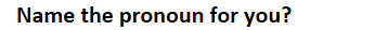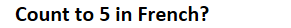 Howold areyou?Name thepronounfor you?Howmany petsdo youhave?How do yousay the inmasculineterms?Do youhavebrothersor sisters?How doyou say thein feminineterms ?Name thepronounfor she?Howmany petsdo youhave?Whatgrade areyou in?What'syourfavouritesportName thepronounfor "youare".What'syourfavouritecolour?What petsdo youhave?Name 3prepositionsHow doyou sayI do?Howareyou?How doyou sayI go?What'syourfavouriteanimal?name thepronounfor I?How manyletters arein yourname?Countto 5 inFrench?Name thepronounfor they?What isyournameName thepronounfor weHowold areyou?Name thepronounfor you?Howmany petsdo youhave?How do yousay the inmasculineterms?Do youhavebrothersor sisters?How doyou say thein feminineterms ?Name thepronounfor she?Howmany petsdo youhave?Whatgrade areyou in?What'syourfavouritesportName thepronounfor "youare".What'syourfavouritecolour?What petsdo youhave?Name 3prepositionsHow doyou sayI do?Howareyou?How doyou sayI go?What'syourfavouriteanimal?name thepronounfor I?How manyletters arein yourname?Countto 5 inFrench?Name thepronounfor they?What isyournameName thepronounfor we