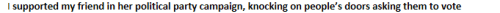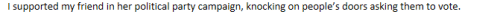 I supported my friend in her political party campaign, knocking on people’s doors asking them to vote