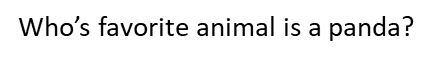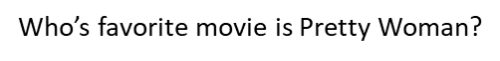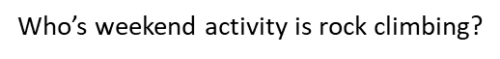 Who’sfavoritemovie isBefore You? Who’sfavoritemovie isPrettyWoman? Who’sfavoritescent iscoconut? Who’sallergic tococonut? Who’sfavoriteanimal isa panda? One of theirfavoriteanimals is araccoon? Who'shobbiesincludesinteriordesign?Who’sfavoritemovie isCorpseBride? Who’shobbiesincludesrollerskating? Who’sfavoritemovie isGrown Up’s? Who’sfavoritesports teamis theRaiders? Who’sweekendactivityincludeskaraoke? Who likesto relax bylaying bythe pool? Who’sfavoritecolor isred? Who'sfavoritesnack ischeetos?Who’sfavoriterestaurant isKogi KoreanBBQ? Who’sfavoritebaseballteam is theA’s? One of theirfavoriterestaurantsis NorthItalia? Who’sfavorite cakeis Chantillycake? Who’sfavoritemovie isHarryPotter? Who’sfavoritedrink istequila? Who'shobbiesincludes artsand crafts? Who’sfavorite teamis GreenPackers?  Who’sweekendactivity is rockclimbing? Who’sfavoritemovie isBefore You? Who’sfavoritemovie isPrettyWoman? Who’sfavoritescent iscoconut? Who’sallergic tococonut? Who’sfavoriteanimal isa panda? One of theirfavoriteanimals is araccoon? Who'shobbiesincludesinteriordesign?Who’sfavoritemovie isCorpseBride? Who’shobbiesincludesrollerskating? Who’sfavoritemovie isGrown Up’s? Who’sfavoritesports teamis theRaiders? Who’sweekendactivityincludeskaraoke? Who likesto relax bylaying bythe pool? Who’sfavoritecolor isred? Who'sfavoritesnack ischeetos?Who’sfavoriterestaurant isKogi KoreanBBQ? Who’sfavoritebaseballteam is theA’s? One of theirfavoriterestaurantsis NorthItalia? Who’sfavorite cakeis Chantillycake? Who’sfavoritemovie isHarryPotter? Who’sfavoritedrink istequila? Who'shobbiesincludes artsand crafts? Who’sfavorite teamis GreenPackers?  Who’sweekendactivity is rockclimbing?