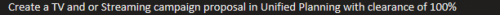 6. Create a TV and or Streaming campaign proposal in Unified Planning with clearance of 100%