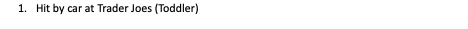 13. Hit by car at Trader Joes (Toddler)