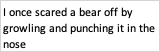 I ran a smallveggie farm onesummer whilebeing drasticallyunder qualifiedto do soI used torun ayouthgroupI met thequeen ofEnglandonce. Sortof.All the sportsI play (thereare three)start with theletter SFree!I accidentallyjoined a cultwhileWWOOFingAs a child iregularly atebugs andtaught all mycousins how toI used tohave apassion formaking sockmonkeysWhen I was a littlekid a weddingused live beta fishin vases as thetable centerpiecesand I rescued tenof them.I used to begenuinely upset thatthe Pillsbury doughboy wasn't real andI couldn't poke histummy like in thecommercialI was the drummajor for myelementaryschool band and Iwon first place inthe local paradeWhensnowboardingI ride goofyI once caught apigeon in thepark and triedto bring it homeas my petOne time mytrailer caughtfire and I madeit out with onlymy guitarI did coke inItaly with arazor blade Ismuggled ona planeI won a sailingtrip in a sandscupturecontest onArubaI dated aprofessional soccerplayer and shebroke up with mebecause she wasgoing to try out forthe olympicsI was trippingand I saw whatI woulddescribe as myaura and itlooked redI grew twosets ofadultcaninesthe first time Ikissed a girl It wasin Italy and Icarried her up 6flights of stairswhile fingering herI waspickpocketedin a foreigncountryI once scareda bear off bygrowling andpunching it inthe noseI once fellinto a comafor threeweeksI’m formallytrained inpolishsaberI was oncethe topreader inmy stateI havebeen hitby over10 carsI didn’t goto schooluntil highschool.My firstcrush wasNightcrawlerfrom the X-menI haven'tdated awoman sincehigh schoolI’veslept ona glacierI built a fullsizetrebuchet inmiddleschoolI share abirthdaywith JustinTimberlakeI lead a group ofhikers out of a trailwhile shitfacedand hiked back infor my booze thenext dayI worked with amustang namedSkylar who wasmean and spicywith most peopleand not fully trainedbut he loved meI've metthree USpresidentsthe first time Ikissed a girl It wasin Italy and Icarried her up 6flights of stairswhile fingering herI ran a smallveggie farm onesummer whilebeing drasticallyunder qualifiedto do soI used torun ayouthgroupI met thequeen ofEnglandonce. Sortof.All the sportsI play (thereare three)start with theletter SFree!I accidentallyjoined a cultwhileWWOOFingAs a child iregularly atebugs andtaught all mycousins how toI used tohave apassion formaking sockmonkeysWhen I was a littlekid a weddingused live beta fishin vases as thetable centerpiecesand I rescued tenof them.I used to begenuinely upset thatthe Pillsbury doughboy wasn't real andI couldn't poke histummy like in thecommercialI was the drummajor for myelementaryschool band and Iwon first place inthe local paradeWhensnowboardingI ride goofyI once caught apigeon in thepark and triedto bring it homeas my petOne time mytrailer caughtfire and I madeit out with onlymy guitarI did coke inItaly with arazor blade Ismuggled ona planeI won a sailingtrip in a sandscupturecontest onArubaI dated aprofessional soccerplayer and shebroke up with mebecause she wasgoing to try out forthe olympicsI was trippingand I saw whatI woulddescribe as myaura and itlooked redI grew twosets ofadultcaninesthe first time Ikissed a girl It wasin Italy and Icarried her up 6flights of stairswhile fingering herI waspickpocketedin a foreigncountryI once scareda bear off bygrowling andpunching it inthe noseI once fellinto a comafor threeweeksI’m formallytrained inpolishsaberI was oncethe topreader inmy stateI havebeen hitby over10 carsI didn’t goto schooluntil highschool.My firstcrush wasNightcrawlerfrom the X-menI haven'tdated awoman sincehigh schoolI’veslept ona glacierI built a fullsizetrebuchet inmiddleschoolI share abirthdaywith JustinTimberlakeI lead a group ofhikers out of a trailwhile shitfacedand hiked back infor my booze thenext dayI worked with amustang namedSkylar who wasmean and spicywith most peopleand not fully trainedbut he loved meI've metthree USpresidentsthe first time Ikissed a girl It wasin Italy and Icarried her up 6flights of stairswhile fingering her
