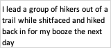 33. I lead a group of hikers out of a trail while shitfaced and hiked back in for my booze the next day