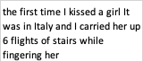 36. the first time I kissed a girl It was in Italy and I carried her up 6 flights of stairs while fingering her