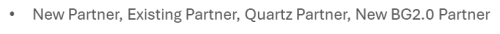 SMS/Afterglowtarget partnerPartner whostruggledwith GT ProExistingpartner(>3 years)FreeChoiceBG 2.0partnerPartnerwithSMSNewpartner(<12months)QuartzPartnerSMS/Afterglowtarget partnerPartner whostruggledwith GT ProExistingpartner(>3 years)FreeChoiceBG 2.0partnerPartnerwithSMSNewpartner(<12months)QuartzPartner