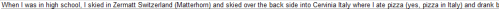 When I was in high school, I skied in Zermatt Switzerland (Matterhorn) and skied over the back side into Cervinia Italy where I ate pizza (yes, pizza in Italy) and drank beer