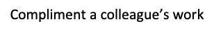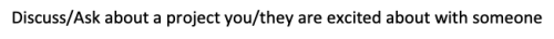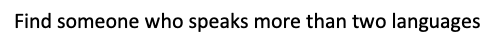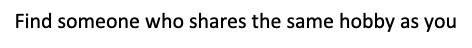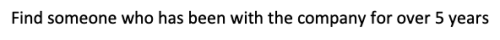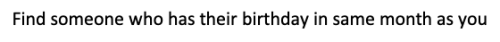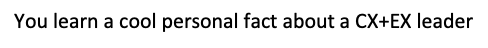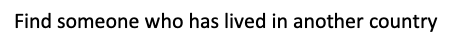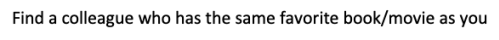 Find acolleague whohas the samefavoritebook/movie asyou Complimentacolleague’swork Volunteer to beteam leader foran activity /Volunteer tolead a breakoutdiscussion Find someonewho speaksmore than twolanguages  Findsomeonewho has livedin anothercountry Learn a coolpersonalfact about ateammate Share a pieceof adviceyou’ve receivedthat impactedyour career Learn abouta CX+EXleader’sfirst job Ask a CX+EXleader whattheir favoritepart of theirjob is Find someonewho has beenwith thecompany forover 5 years Guess correctlywho wrote thefact aboutthemselves inthe SnowballFight icebreaker Findsomeonewho sharesthe samehobby as you You learn acool personalfact about aCX+EXleader Find someonewho has theirbirthday insame monthas you Discuss/Askabout a projectyou/they areexcited aboutwith someone Guesssomeone'sfavorite coloron the firsttry.Find acolleague whohas the samefavoritebook/movie asyou Complimentacolleague’swork Volunteer to beteam leader foran activity /Volunteer tolead a breakoutdiscussion Find someonewho speaksmore than twolanguages  Findsomeonewho has livedin anothercountry Learn a coolpersonalfact about ateammate Share a pieceof adviceyou’ve receivedthat impactedyour career Learn abouta CX+EXleader’sfirst job Ask a CX+EXleader whattheir favoritepart of theirjob is Find someonewho has beenwith thecompany forover 5 years Guess correctlywho wrote thefact aboutthemselves inthe SnowballFight icebreaker Findsomeonewho sharesthe samehobby as you You learn acool personalfact about aCX+EXleader Find someonewho has theirbirthday insame monthas you Discuss/Askabout a projectyou/they areexcited aboutwith someone Guesssomeone'sfavorite coloron the firsttry.