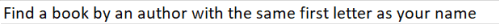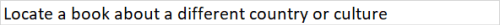 Free!Find a bookby an authorwith the samefirst letter asyour name Find anonfictionbook Find amystery oradventurebook Read apagequietly Find abook witha numberin the title Find a bookthat hasbeen madeinto a movie Check outa book onanimals Choose abook witha funnytitle Ask thelibrarianto suggesta book Find abookaboutspace Look fora sciencebook Locate abook about adifferentcountry orculture Read the firstpage of a bookand guess whatwill happen  Find abook witha historicaltheme Look for abiographyof a famousperson Free!Find a bookby an authorwith the samefirst letter asyour name Find anonfictionbook Find amystery oradventurebook Read apagequietly Find abook witha numberin the title Find a bookthat hasbeen madeinto a movie Check outa book onanimals Choose abook witha funnytitle Ask thelibrarianto suggesta book Find abookaboutspace Look fora sciencebook Locate abook about adifferentcountry orculture Read the firstpage of a bookand guess whatwill happen  Find abook witha historicaltheme Look for abiographyof a famousperson
