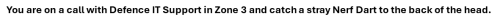 You are on a call with Defence IT Support in Zone 3 and catch a stray Nerf Dart to the back of the head.