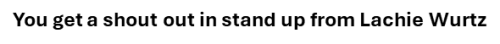 You get a shout out in stand up from Lachie Wurtz