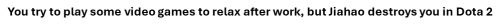 You try to play some video games to relax after work, but Jiahao destroys you in Dota 2