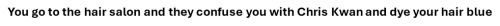 You go to the hair salon and they confuse you with Chris Kwan and dye your hair blue