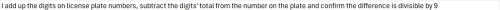 I add up the digits on license plate numbers, subtract the digits' total from the number on the plate and confirm the difference is divisible by 9