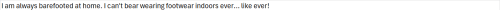 I am always barefooted at home. I can't bear wearing footwear indoors ever… like ever!