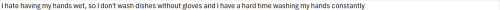 I hate having my hands wet, so I don't wash dishes without gloves and I have a hard time washing my hands constantly